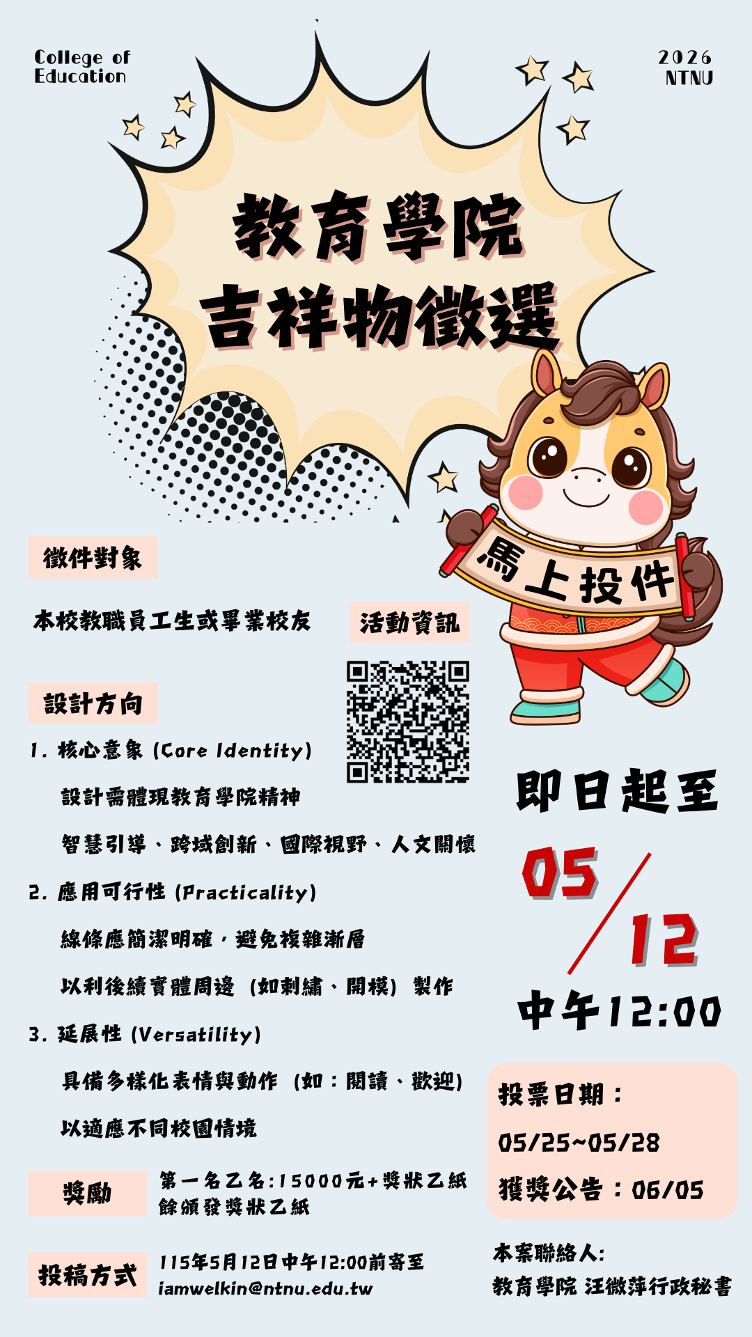 請將所有檔案壓縮為資料夾,並於115年5月12日中午12:00前寄至:iamwelkin@ntnu.edu.tw,並在信件主旨註明:「教育學院吉祥物徵稿-姓名」。